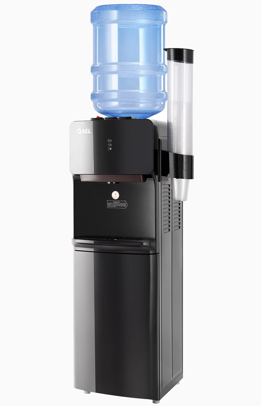 Напольный кулер с верхней загрузкой бутыли с компрессорным охлаждением черного цвета, глянцевый. Высота кулера 930мм позволяет комфортно нажимать на три клавиши, одна из которых - горячей воды - имеет защиту от случайного нажатия. Цвет: черный глянец.