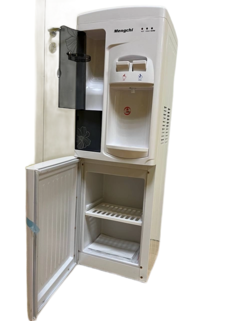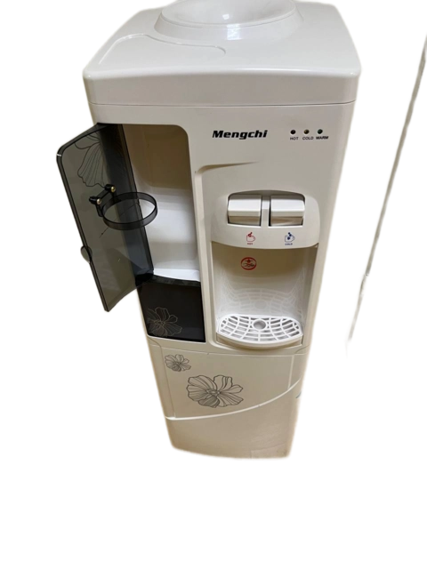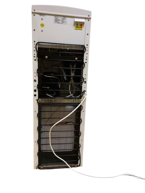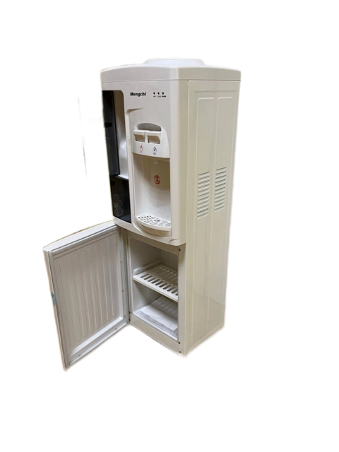 Напольный кулер для воды с верхней загрузкой бутыли в корпусе белого цвета, оснащен шкафчиком. Аппарат имеет два удобных крана для подачи воды типа "нажим кружкой" (горячая/холодная). С компрессорным типом охлаждения. Нагревательный элемент внутренний, спиральный.
